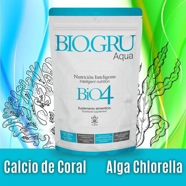 BIO.GRU Aqua se ha creado eligiendo lo mejor de la naturaleza. La sinergia de sus componentes combina principios ancestrales con lo más actual de la investigación científica. Entre los principales elementos de BIO.GRU Aqua se encuentran el Calcio de coral ionizado y el alga chlorella; dichos ingredientes aportan los minerales, proteínas y vitaminas necesarias para nuestro organismo de una forma completamente orgánica y altamente biodisponible.