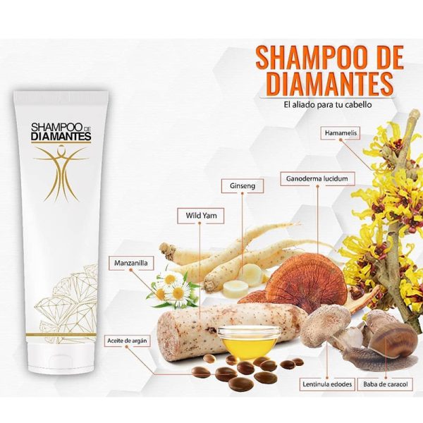 SHAMPOO DE DIAMANTES contiene baba de caracol rica en alantofna biodisponible – colágeno, elastina y extracto de wild yam, el cual al ser absorbido vía cutánea contribuye al equilibrio hormonal (factor importante en la producción de cabello y uñas). Además, posee aceites naturales de uso diario para la limpieza y el cuidado del cabello.